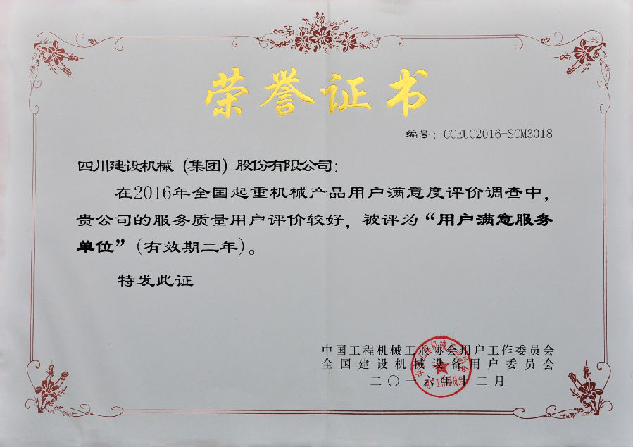 2016年全國用戶滿意產(chǎn)品評價測評結(jié)果公布,四川建設(shè)機械(集團(tuán))股份有限公司憑借良好的產(chǎn)品和服務(wù)質(zhì)量獲得全國用戶的較高評價,榮獲了“全國塔機用戶滿意十強”企業(yè);獲得產(chǎn)品質(zhì)量調(diào)查連續(xù)十一次評價“全國用戶滿意”企業(yè);公司生產(chǎn)的C7022、C7050、C7030、P7527塔式起重機以及SC200/200W施工升降機被評為“全國用戶滿意產(chǎn)品”;同時獲得“用戶滿意服務(wù)”獎;1989年至今川建已連續(xù)十一次獲得全國用戶滿意獎,得到了業(yè)內(nèi)用戶的高度認(rèn)可。