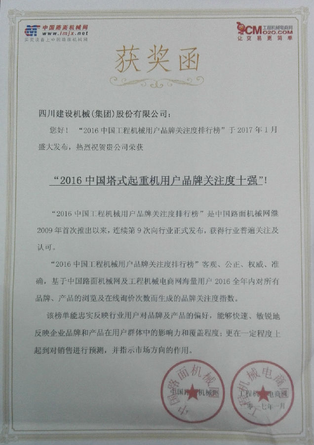 2017年1月3日,中國路面機械網(wǎng)和工程機械電商網(wǎng)在北京發(fā)布“2016中國塔式起重機用戶關注度排行榜”,四川建設機械(集團)股份有限公司進入“2016中國塔式起重機用戶品牌關注度排行榜”前十強,排名第二位。