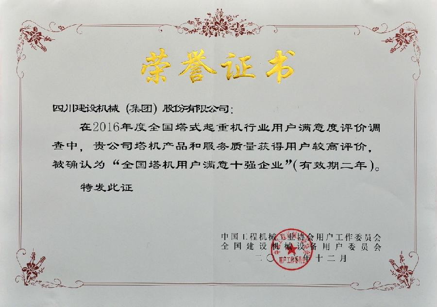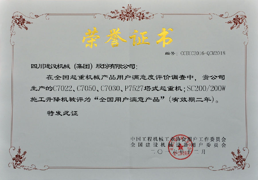 2016年全國用戶滿意產(chǎn)品評價(jià)測評結(jié)果公布,四川建設(shè)機(jī)械(集團(tuán))股份有限公司憑借良好的產(chǎn)品和服務(wù)質(zhì)量獲得全國用戶的較高評價(jià),榮獲了“全國塔機(jī)用戶滿意十強(qiáng)”企業(yè);獲得產(chǎn)品質(zhì)量調(diào)查連續(xù)十一次評價(jià)“全國用戶滿意”企業(yè);公司生產(chǎn)的C7022、C7050、C7030、P7527塔式起重機(jī)以及SC200/200W施工升降機(jī)被評為“全國用戶滿意產(chǎn)品”;同時(shí)獲得“用戶滿意服務(wù)”獎(jiǎng);1989年至今川建已連續(xù)十一次獲得全國用戶滿意獎(jiǎng),得到了業(yè)內(nèi)用戶的高度認(rèn)可。