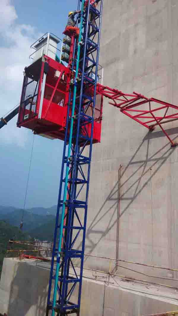 用于載人和提升物件的兩臺(tái)施工升降機(jī)配置高度均為248米,3×15kW三電機(jī)驅(qū)動(dòng),額定提升速度0~55 m/min,電纜形式采用滑觸式,解決了超高施工升降機(jī)的電纜自重負(fù)荷問(wèn)題。