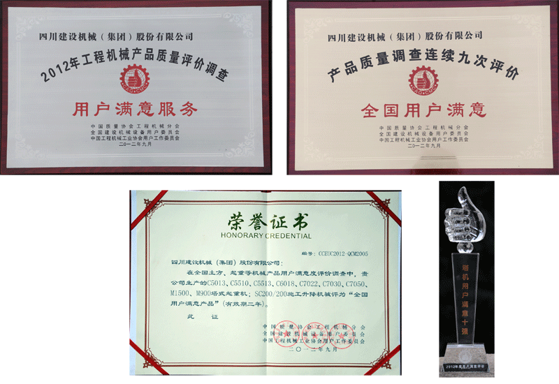 會議上,侯寶佳秘書長公布了用戶滿意產品、滿意服務企業(yè)及塔機用戶滿意十強等評選名單,對到會的企業(yè)代表及個人進行了現(xiàn)場表彰,并對連續(xù)三次以上獲得用戶滿意產品稱號的企業(yè)進行表彰。四川建設機械(集團)股份有限公司在2012年工程機械產品質量評價調查中獲得“用戶滿意服務”,迄今為止已經(jīng)是(集團)公司產品“質量調查連續(xù)九次評價全國用戶滿意”。公司生產的C5013、C5510、C5513、C6018、C7022、C7030、C7050、M900、M1500塔式起重機以及SC200/200施工升降機被評為“全國用戶滿意產品”。同時,協(xié)會在用戶滿意產品的基礎上評選出2012年塔式起重機行業(yè)“全國塔機用戶滿意十強”企業(yè),包括四川建設機械(集團)股份有限公司、撫順永茂建筑機械有限公司、中聯(lián)重科股份有限公司、廣西建工集團建筑機械制造有限責任公司、北京永茂建工機械制造有限公司、沈陽三洋建筑機械有限公司、浙江省建設機械集團有限公司、湖北江漢建筑工程機械有限公司、浙江虎霸建設機械有限公司、江蘇正興建設機械有限公司。