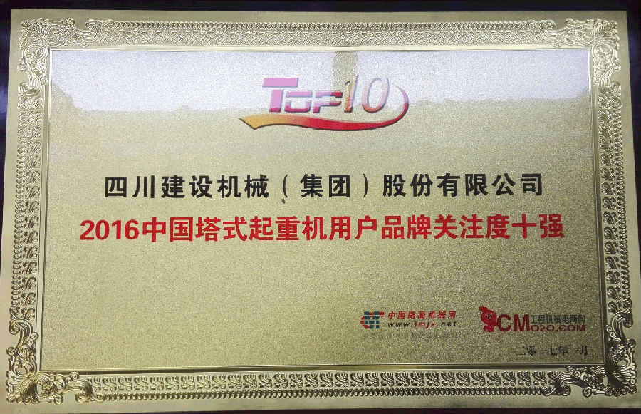 2017年1月3日,中國路面機械網(wǎng)和工程機械電商網(wǎng)在北京發(fā)布“2016中國塔式起重機用戶關(guān)注度排行榜”,四川建設(shè)機械(集團(tuán))股份有限公司進(jìn)入“2016中國塔式起重機用戶品牌關(guān)注度排行榜”前十強,排名第二位。