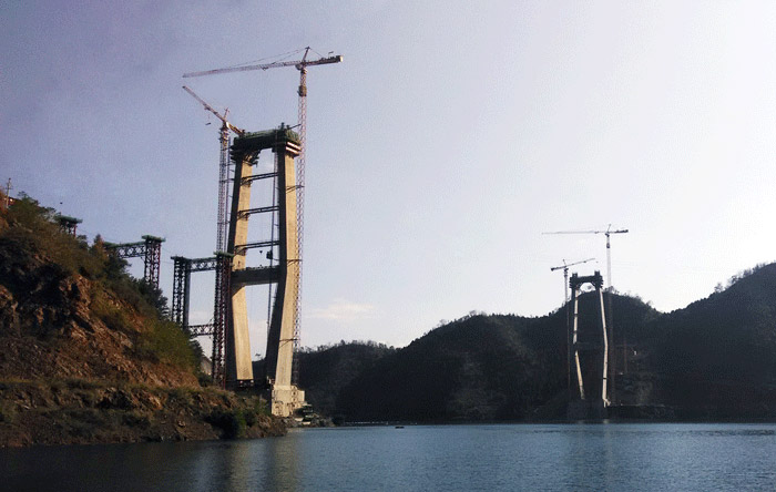紅水河特大橋兩側(cè)橋墩高度均為210米,每個橋墩的起重機械配置均為川建生產(chǎn)的一臺C7036塔機、一臺C7030塔機和兩臺SC200/200WPZ中速變頻施工梯,副墩的施工機械為一臺P125平頭式塔機。